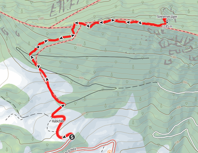 Vom Parkplatz aus folgen wir einige Meter lang der Straße aufwärts, bis eine Schotterstraße nach rechts abzweigt. Gut erkennbar ist die Abzweigung durch ein Schild, auf dem der Schieferstein angeschrieben ist. Den rot-weiß-roten Schildern folgen wir der Schotterstraße ein kurzes Stück lang, bis wir eine Wiese erreichen, der wir sehr steil aufwärts folgten. Am Ende der Wiese erreichten wir wieder die Forststraße, wir querten diese, und stiegen weiter über einen Waldpfad auf. Gleich darauf querten wir ein weiteres Mal die Forststraße, stiegen aber auch gleich wieder in den Waldpfad ein. Diesem folgten wir dann aufwärts.
